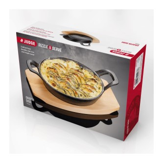 Created in durable cast iron for excellent heat conduction and retention. With heat-resistant maple wood serving stand. From oven to table, retains heat while serving and keeps food hotter for longer. Cast iron body suitable for BBQs.
