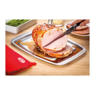 Sturdy carving tray with recessed gutter keeps juices away from your table. 5 retaining spikes, holds meat, poultry sturdy whilst carving. Serve straight to the table