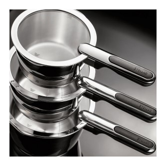 Designed for easy one handed draining. Time saving thanks to easy-to-read internal measuring guides. Even heat distribution due to 'hot forged' bases. Space-saving lid design that is stackable for easy storage.