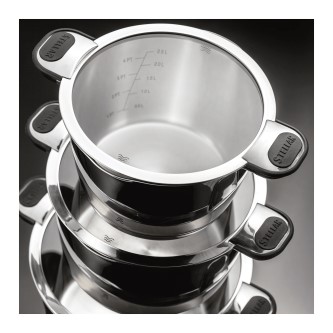Designed for easy one handed draining. Time saving thanks to easy-to-read internal measuring guides. Even heat distribution due to 'hot forged' bases. Space-saving lid design that is stackable for easy storage.