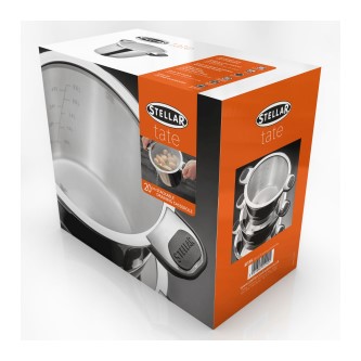 Designed for easy one handed draining. Time saving thanks to easy-to-read internal measuring guides. Even heat distribution due to 'hot forged' bases. Space-saving lid design that is stackable for easy storage.
