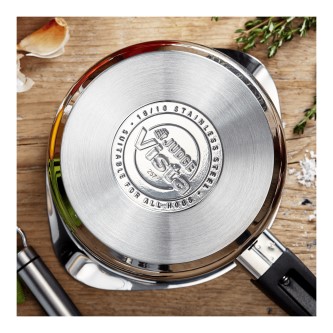 Features internal time-saving measuring guides. Allows for safe and secure handling thanks to the easy grip, comfortable, phenolic low-heat transmission handle. Shatter proof vented glass lid for over boil prevention.
