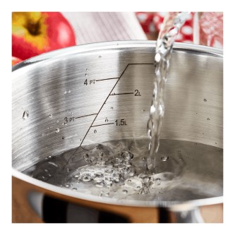 A best-selling classic with impressive performance due to even heat distribution from 'hot forged' base. Has generous pouring lips and double sided straining lid, allowing for variable draining options and adjustable steam release. Features internal time-saving measuring guides.