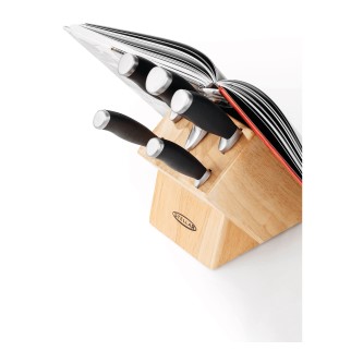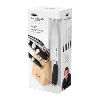 Designed in cooperation with James Martin to maximise performance and suit the smaller hand. Moulded compound anti-slip handles that allow for a firm and safe grip. Very easy to sharpen. With recipe book holder