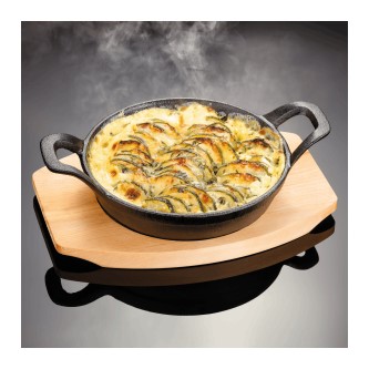 Created in durable cast iron for excellent heat conduction and retention. With heat-resistant maple wood serving stand. From oven to table, retains heat while serving and keeps food hotter for longer. Cast iron body suitable for BBQs.